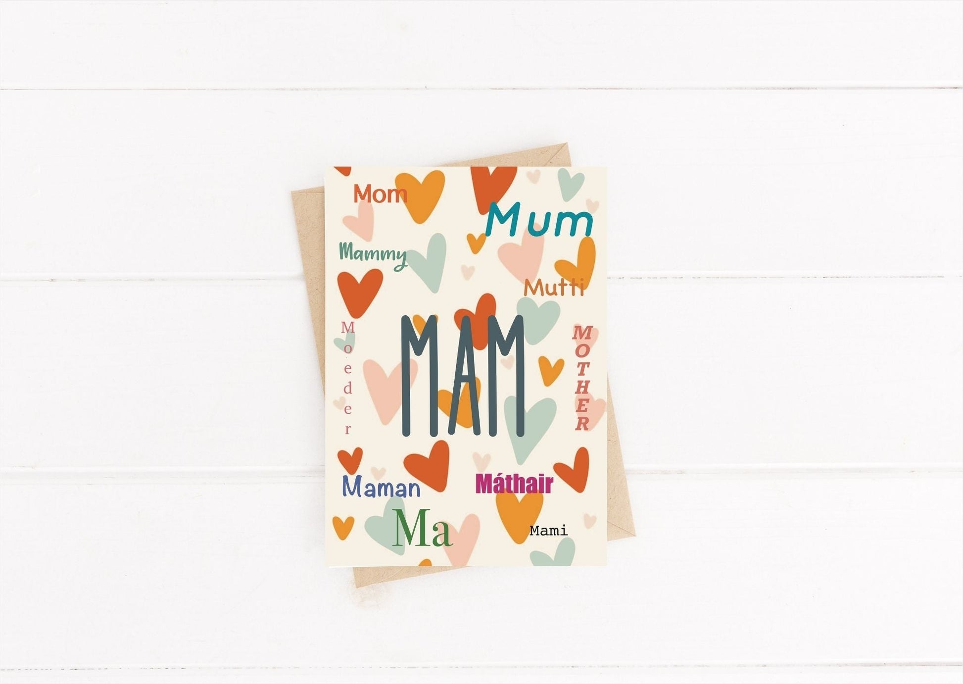 Cute and colourful card saying Mam in many languages.